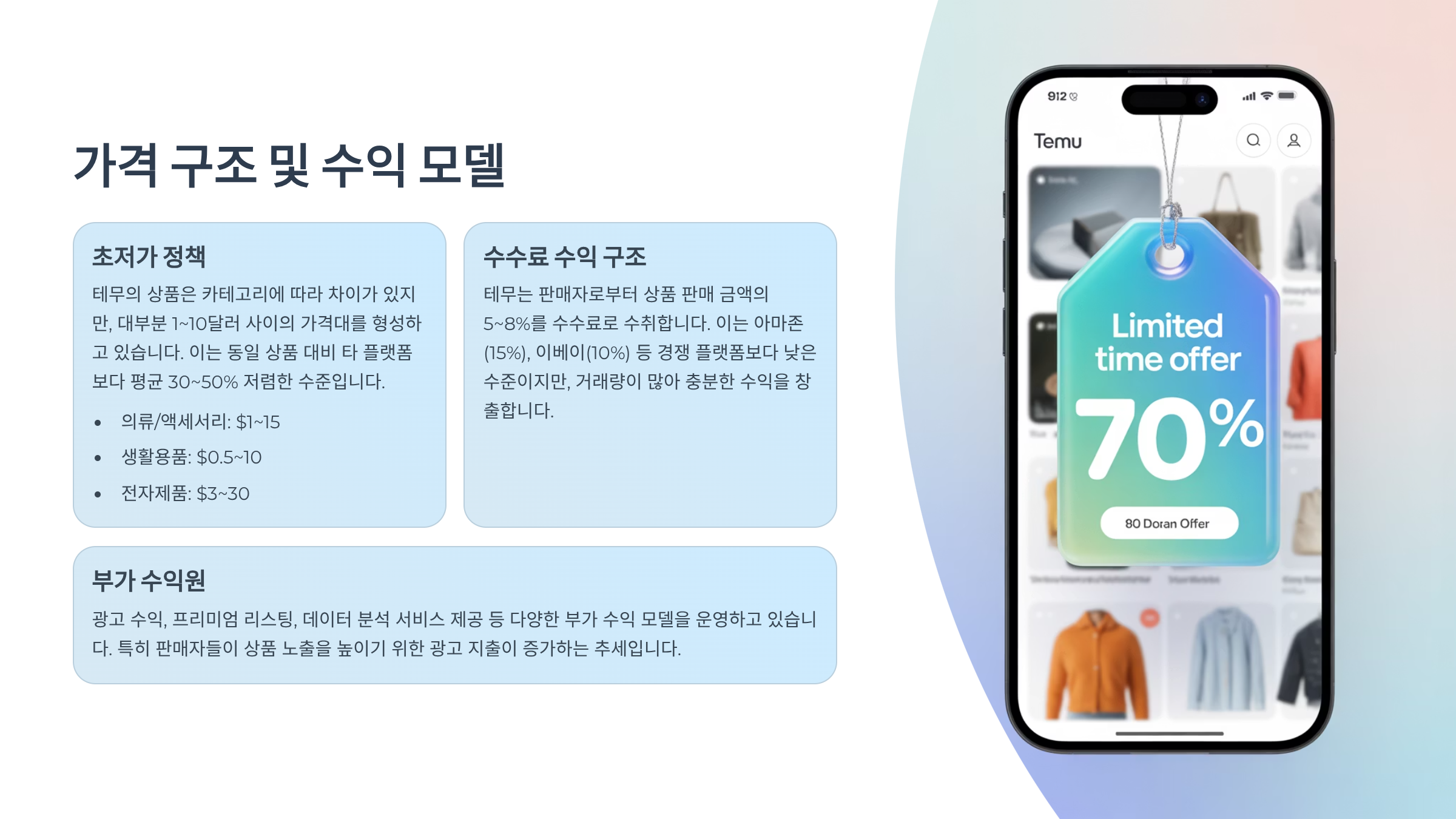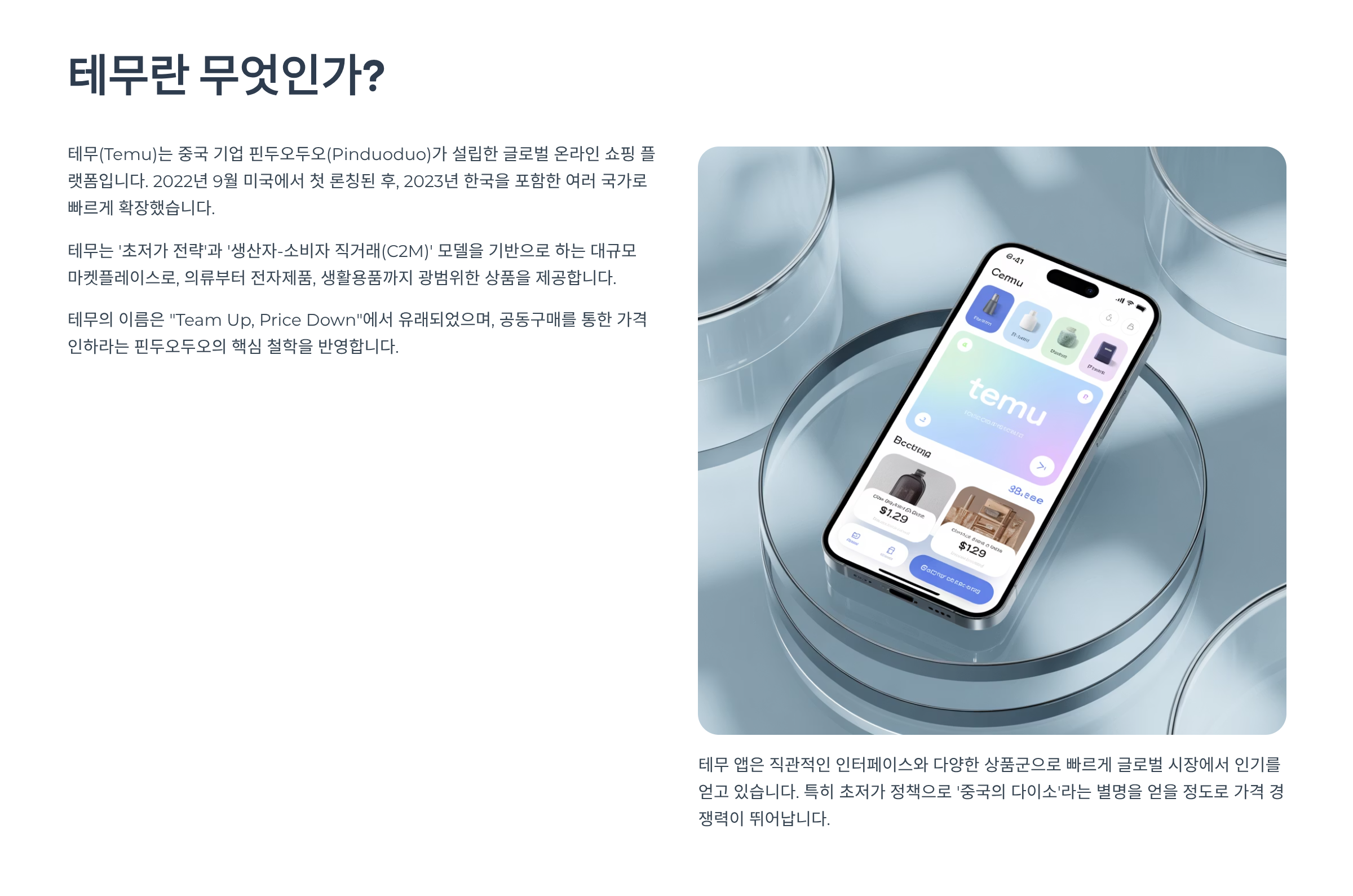 Temu는 최근 온라인 쇼핑 애호가들 사이에서 급부상한 글로벌 이커머스 플랫폼이에요. 중국 기반의 거대 기업 PDD Holdings가 운영하고 있고, 가격 경쟁력이 엄청난 게 특징이에요. 옷, 생활용품, 전자제품, 뷰티까지 안 파는 게 없을 정도로 상품군이 다양한데요, 특히나 "무료배송"과 "파격적 할인"으로 사람들을 유혹하죠. 약간 '알리익스프레스 미국판' 같은 느낌이랄까요?